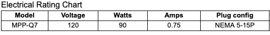 Below is the electrical chart and plug configuration